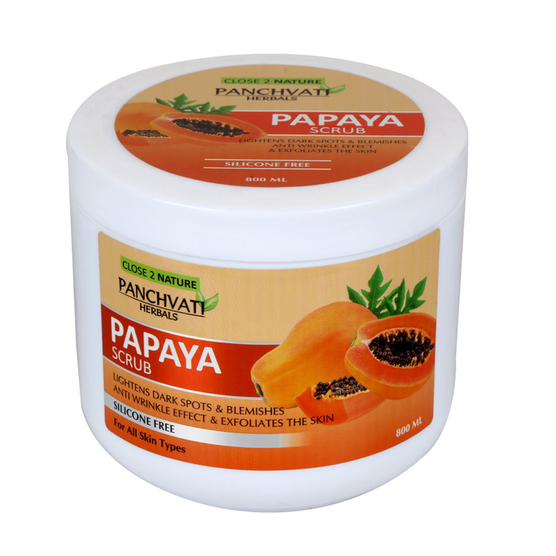PanchvatI Herbals Papaya Scrub Unclogs Pore openings and eliminates dirt. Gentle exfoliating action uncovers skin's natural brightness for younger-looking complexion